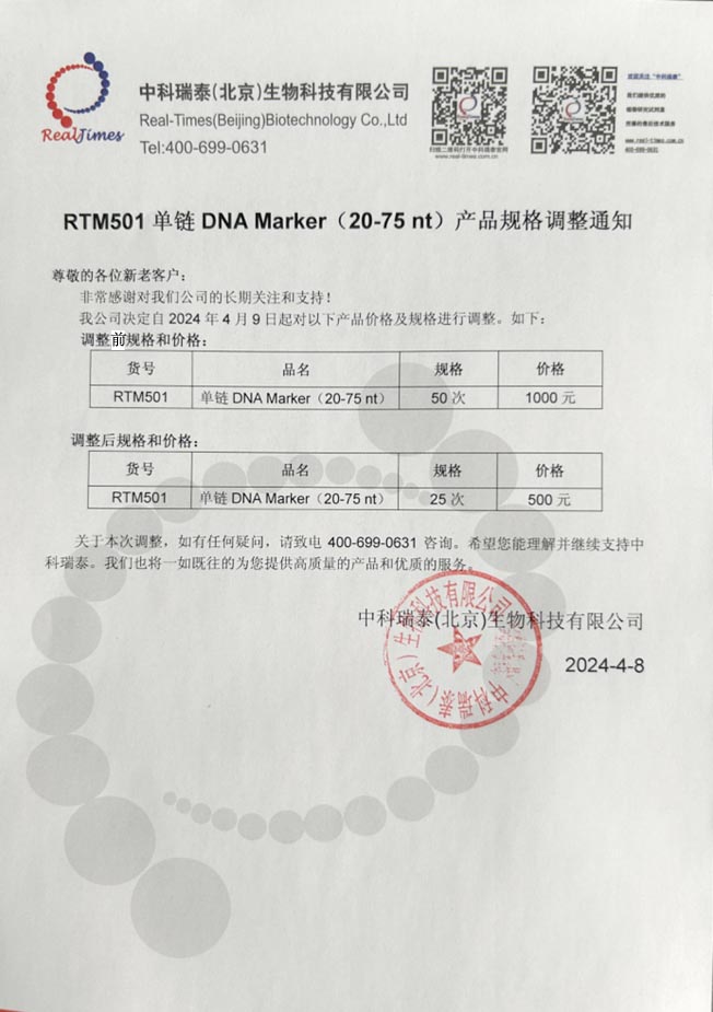 RTM501單鏈DNA Marker(20-75 nt)產(chǎn)品規(guī)格調(diào)整通知