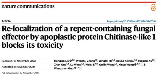 《Nature Communications》發(fā)表棉花遺傳育種團(tuán)隊“Re-localization of a repeat-containing fungal effector by apoplastic protein Chitinase-like 1 blocks its toxicity”
