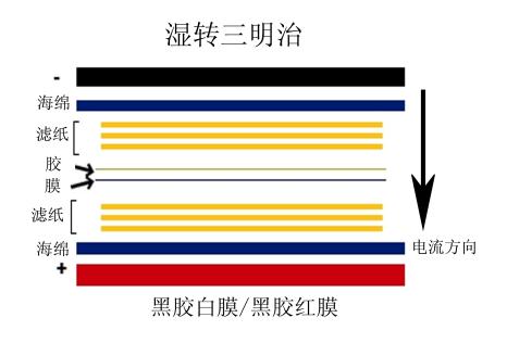 3.3 三明治結構:轉膜三明治結構與傳統(tǒng)轉膜相同,即根據“黑膠白膜”制作三明治,即膜置于轉膜夾芯正極一側,凝膠置于轉膜夾芯負極一側,這樣凝膠上帶負電荷的蛋白才能轉移到膜上。