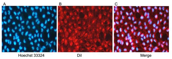 ml PBS,觀察拍照(40×)(圖A);去除PBS,DiI染色,37度10分鐘,去除DiI染色液,加1.5ml PBS,觀察拍照(40×)(圖B)