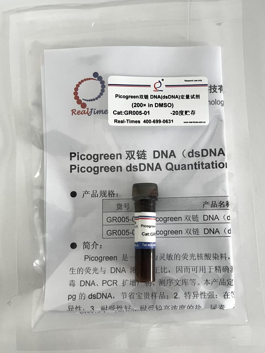 Picogreen 是一種極為靈敏的熒光核酸染料,其僅在與DNA 雙鏈結(jié)合后才發(fā)出熒光,且所產(chǎn)生的熒光與 DNA 濃度呈正比,因而可用于精確測(cè)量多個(gè)來源的 dsDNA,包括基因組 DNA、病毒 DNA、PCR 擴(kuò)增產(chǎn)物、測(cè)序文庫(kù)等。本產(chǎn)品定量具有以下優(yōu)勢(shì):1. 靈敏度高:可檢測(cè)低至200 pg的dsDNA,節(jié)省寶貴樣品;2. 特異性強(qiáng):在等摩爾的RNA存在的條件下,對(duì)dsDNA具有特異性;3. 耐受性好:耐受較高濃度的鹽、尿素、乙醇、氯仿、去垢劑、蛋白或瓊脂糖,可以直接定量PCR擴(kuò)增產(chǎn)物而無需從反應(yīng)混合物中純化DNA。4. 易于使用-只需在樣品中加入染料,等待5分鐘,然后讀數(shù)即可,且適用于96和384孔板;與大多數(shù)基于熒光的酶標(biāo)儀和熒光計(jì)兼容。5. 適用范圍廣:可適用于PCR的分析、芯片樣品、DNA損傷分析、酶活分析、基因組DNA定量以及復(fù)雜混合物中dsDNA的檢測(cè)和病毒DNA定量等多種領(lǐng)域。