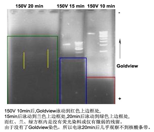 注:預(yù)染法,Goldview染色會出現(xiàn)陰陽膠現(xiàn)象,即隨著電泳時間延長,較小的片段會染色不清楚,(參見實驗示例),此時可以將凝膠用后染法染色即可看到小片段條帶。