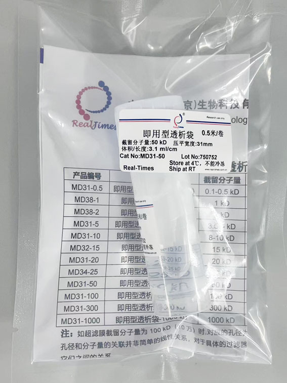2.用蒸餾水徹底清洗透析袋,兩頭用手微微捏住,檢查是否有漏袋。透析袋保存液含有防腐劑,對活性物質(zhì)有抑制作用,至少用蒸餾水(純水、去離子水均可)反復(fù)沖洗三次,有時間最好用蒸餾水浸泡30分鐘再使用。