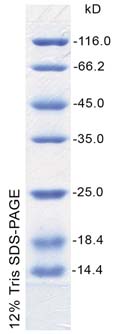 本產(chǎn)品包含7種已知分子量的標(biāo)準(zhǔn)蛋白質(zhì)組成,分子量范圍為14.4kD-116kD,可以用來判斷 SDS-PAGE未知蛋白的分子量。本成品由于含有SDS,不適于非變性膠蛋白電泳(Native