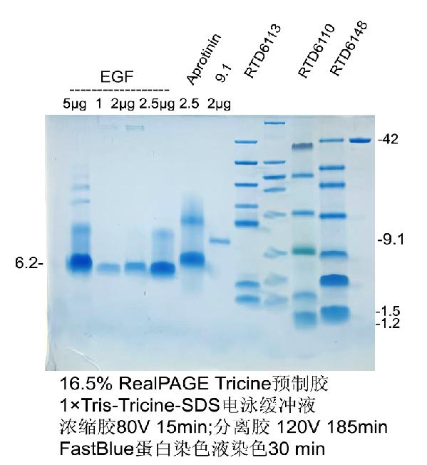 RealPAGE Tricine預(yù)制膠可以用來(lái)檢測(cè)2.5-40 kD的多肽大小。預(yù)制膠玻璃板尺寸10×8.2 cm,凝膠尺寸8.2×7.2 cm,凝膠厚度1.1