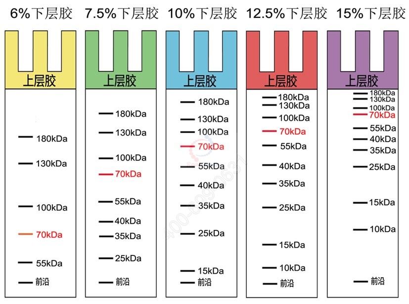 kDa,含有 10 條蛋白條帶 ) 在不同濃度的 SDS-PAGE凝膠中的分離示意圖。因溫度、pH 值等因素不同,實際分離情況會略有出入,本圖僅供參考。