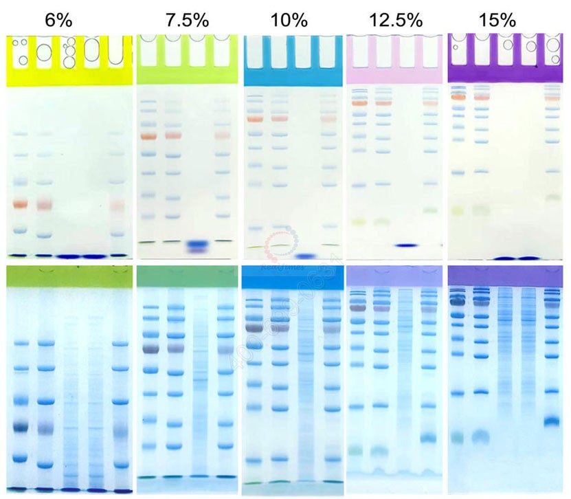該產(chǎn)品利用聚丙烯酰胺凝膠電泳原理,采用上層膠和下層膠的預(yù)混配方,只需加入改良型促凝劑,可在15-30分鐘內(nèi)配制得到高質(zhì)量的聚丙烯酰胺凝膠,可用于變性和非變性蛋白凝膠電泳,適用于Tris-甘氨酸電泳體系(Laemmli體系)。本產(chǎn)品可以配制6%(黃色上層膠)、7.5%(綠色上層膠)、10%(藍色上層膠)、12.5%(紅色上層膠)和15%(紫色上層膠)的分離膠濃度,所配的上層膠帶有顏色 (黃色、綠色、藍色、紅色或紫色 ),點樣孔清晰易辨,方便點樣,可以滿足絕大多數(shù)蛋白電泳需求。