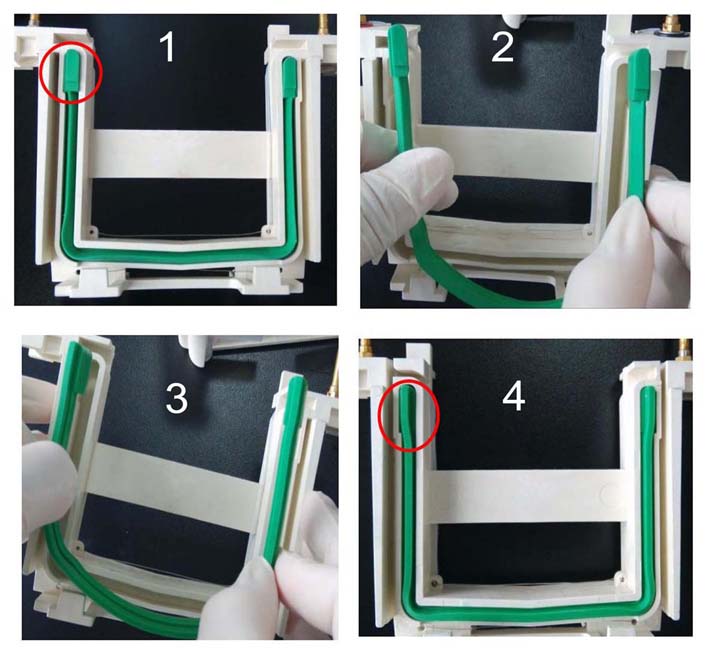 注:伯樂Mini III或Mini-PROTEAN Tetra Cell,天能VE-180,六一24K系列電泳槽請(qǐng)確保密封條的安裝方向(下圖)。