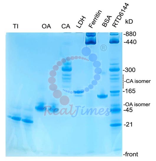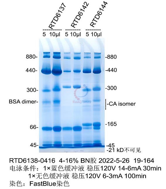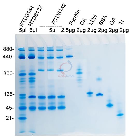 2. 該產(chǎn)品不含蛋白凝膠制備試劑,您可以選擇非變性PAGE凝膠制備及電泳試劑盒(貨號:RTD6130)或者蛋白預(yù)制膠(貨號RTD6118)。如自備試劑,經(jīng)典Laemmli系統(tǒng)中把制膠溶液、電泳緩沖液和上樣緩沖液中的SDS和還原劑(DTT或β-巰基乙醇)全部去除即可進(jìn)行非變性電泳。