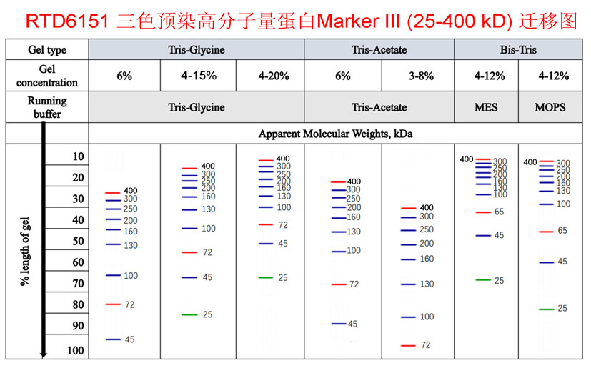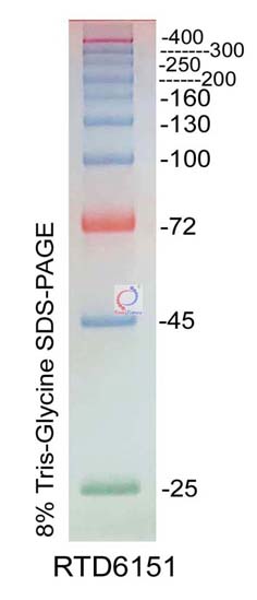 本產(chǎn)品包含10種純化的預(yù)染蛋白質(zhì)組成,分子量范圍為25-400 kD (25, 45, 72, 100, 130, 160200,250, 300 kD),其中400 kD為暗紅色,72 kD條帶為橙紅色,25 kD為綠色,其余條帶為藍(lán)色,可以用于SDS-PAGEWestern Blot轉(zhuǎn)膜時確定未知蛋白的分子量。