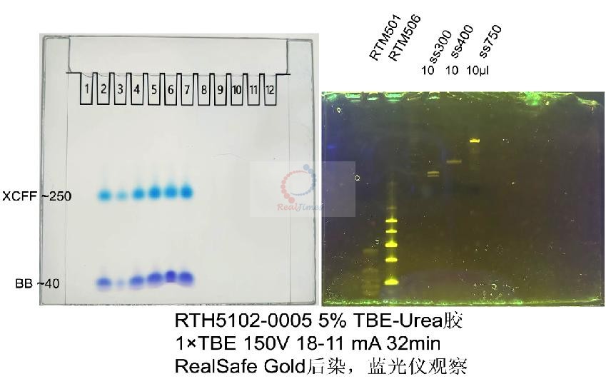 單鏈DNA或RNA樣品可以用單鏈DNA PAGE電泳染色試劑盒(貨號:RTS5103),核酸PAGE電泳染色試劑盒(貨號:RTS5102)或核酸快速高靈敏度染色試劑盒(貨號:RTS5101)染色均可以得到清晰的條帶分離效果。注:如果使用核酸染料染色,RealSafe Red(貨號:GR002)或RealSafe All(貨號:GR004)核酸染料結合單鏈核酸效果最佳,強烈建議使用以便獲得最佳效果的膠圖。其余染料如GelRed,Goldview,EB等染色效果不好。