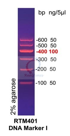 本產(chǎn)品是由6條帶狀雙鏈DNA條帶組成,適用于瓊脂糖凝膠電泳中DNA條帶的分析。產(chǎn)品中已含有1×loading buffer,可根據(jù)實(shí)驗(yàn)需要,直接取2-5μl電泳,使用方便,電泳圖像清晰。6條帶的大小和含量分別為100(50 ng/5 μl),200(50 ng/μl),300(50 ng/μl),400100 ng/μl,500(50 ng/μl),600(50 ng/μl) bp。其中400bp條帶加亮顯示。