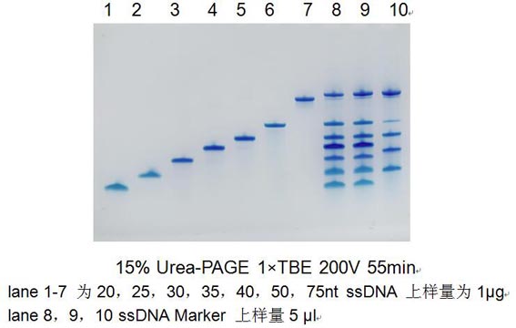 注:1. 染色時(shí)間不要太長(zhǎng),更不能過夜染色。長(zhǎng)時(shí)間染色會(huì)導(dǎo)致ssDNA游離出凝膠,導(dǎo)致膠上無帶。