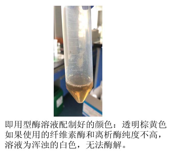 溶解好的正常酶溶液應(yīng)為澄清棕黃色溶液,如使用純度不好的酶,溶液為不溶解的乳白色懸濁液,不能使用。
